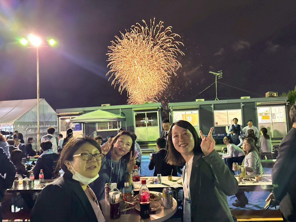 その後の大懇親会では、飛鳥ドライビングカレッジ川口において、川口YEGが設営する「川口花火大会(7万人規模)」を見ながら、地元の美味しい食べ物やお酒をいただき、他県のYEGメンバーと交流する大変貴重な経験をさせていただきました。とても友好的で熱量を持ったYEGメンバーと、県を超えて新たな絆が生まれた素晴らしい機会となりました。