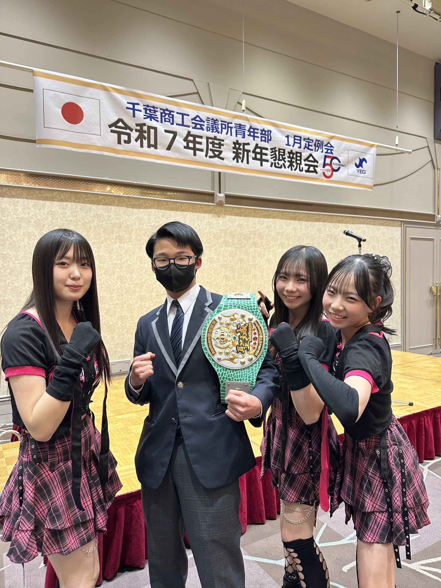 会の後半では、当青年部 日暮副会長のご子息でキックボクサーである拳伸ジム 洸冴選手の迫力あるパフォーマンスにより、大いに盛り上がりました。続いて、千葉商工会議所青年部50周年特別委員会より2月7日(土)開催予定の50周年事業、2月14日(土)開催予定の県連大会のPRを行い、当青年部OB会 会長 森山浩一様の中締め、サプライズとして第5部長 山口和夫様、第24代会長 長坂圭将様がご来場いただき一言ご挨拶を頂戴した後、写真撮影をもって閉会となりました。